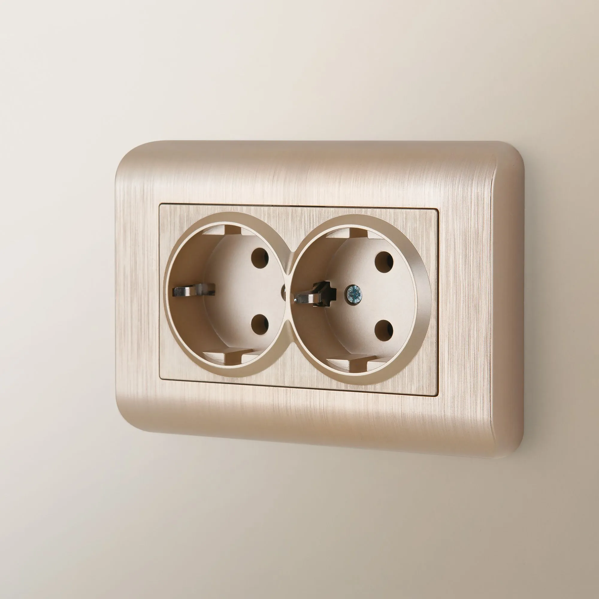 Лицевая панель выполнена из термостойкого поликарбоната — материала, устойчивого к нагреву, ударам и выцветанию. Благодаря лаконичному дизайну и цвету шампань, розетка гармонично вписывается в любой интерьер.